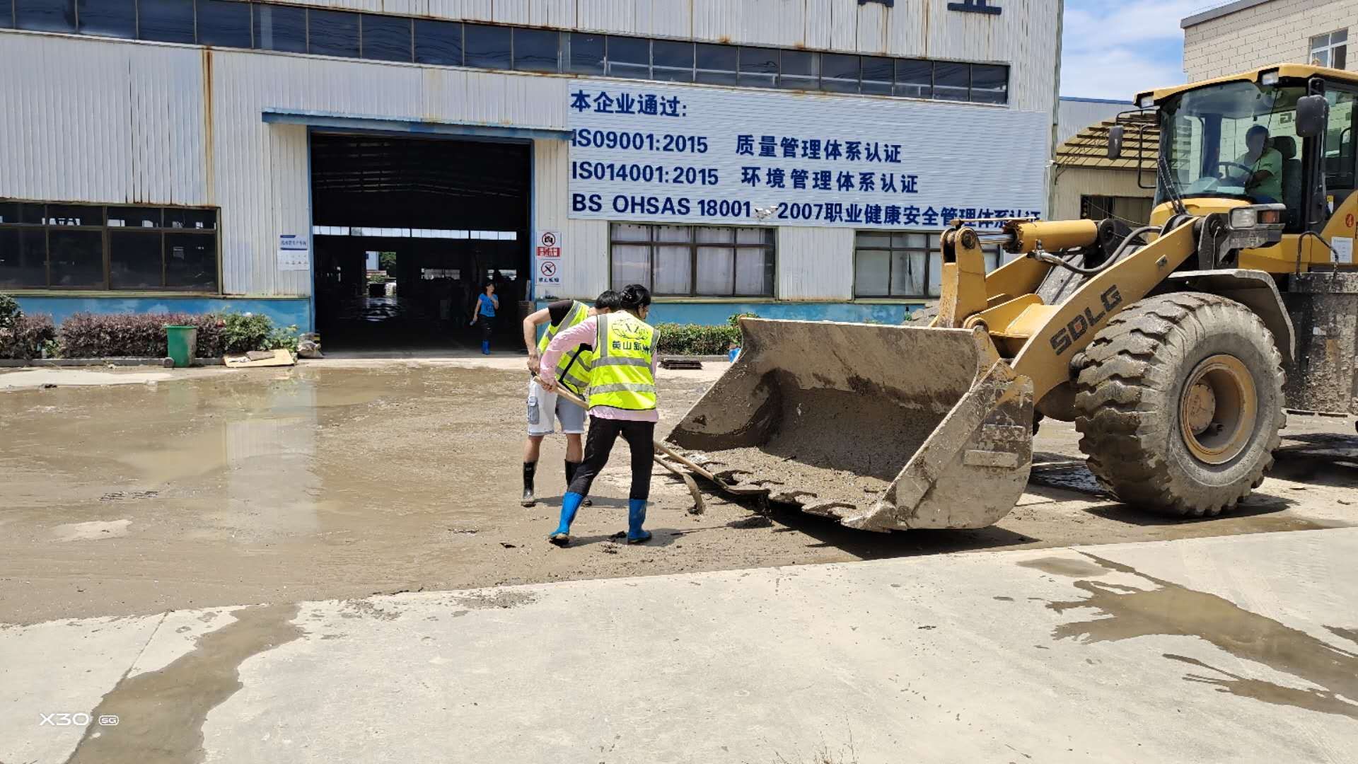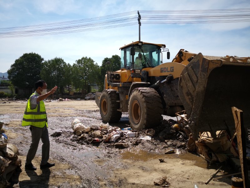 上午8時許,黃山新洲公司黨員、入黨積極分子、抗洪搶險志愿者開著鏟車、灑水車從屯溪區(qū)出發(fā)到達(dá)歙縣經(jīng)開區(qū)受澇嚴(yán)重的黃山順濤管業(yè)有限公司進(jìn)行衛(wèi)生清掃,先清理垃圾及淤泥,再進(jìn)行集中消毒消殺。烈日炎炎,新洲支部的黨員志愿者們個個不怕臟,不怕累,頂著烈日,揮汗如雨。通過一個上午的勞動,在人機(jī)配合下,掃除了垃圾,清除了表面泥土,受災(zāi)企業(yè)的工作環(huán)境煥然一新。