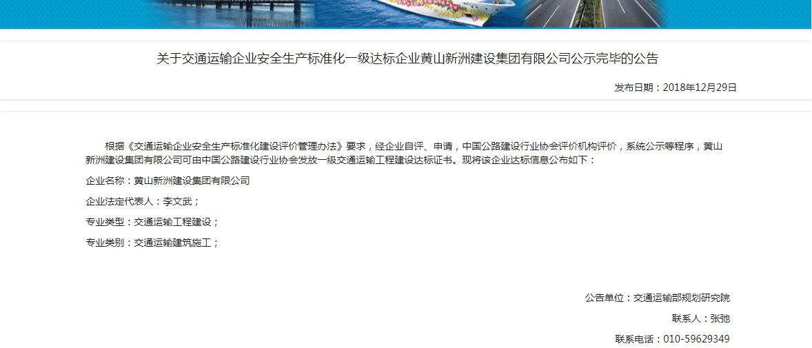 近日從交通運(yùn)輸企業(yè)安全生產(chǎn)標(biāo)準(zhǔn)化管理系統(tǒng)獲悉,黃山新洲建設(shè)集團(tuán)有限公司交通運(yùn)輸部安全生產(chǎn)標(biāo)準(zhǔn)化一級(jí)達(dá)標(biāo)已公告,標(biāo)志著我集團(tuán)公司的交通建設(shè)工程安全生產(chǎn)標(biāo)準(zhǔn)化工作上升了一個(gè)新的臺(tái)階。自2018年1月份開始至今安全生產(chǎn)標(biāo)準(zhǔn)化創(chuàng)標(biāo)工作經(jīng)過一年多的申報(bào)、現(xiàn)場(chǎng)考核、考評(píng)工作圓滿結(jié)束。